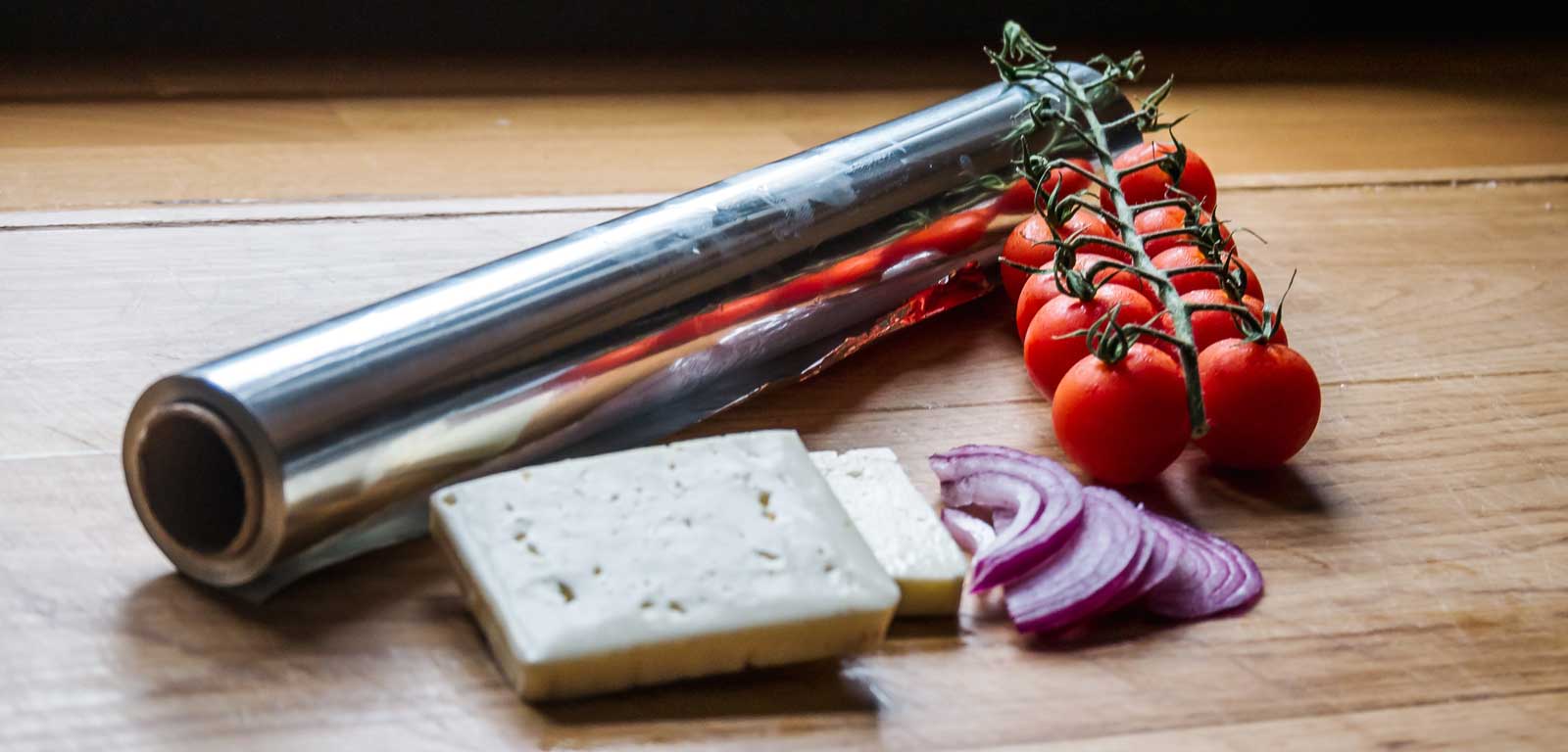 2. Ein Stück Alufolie mit etwas Öl einstreichen, den Feta mit Füllung darauf positionieren und zu einer Feta-Tomaten-Bombe zusammenwickeln.