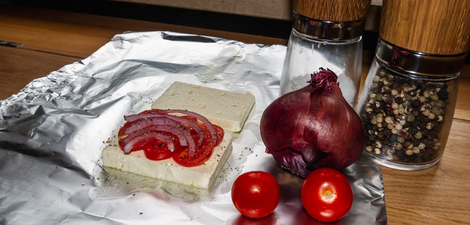 1. Den Feta horizontal halbieren, die Tomatenscheiben und die Zwiebelstücke darauf positionieren und mit Salz, Pfeffer, Knoblauch und allem was das Grilherz begehrt verfeinern.